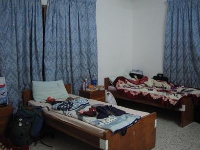 唯一の欠点はバスルーム。部屋にはなくて共同なんだけど、狭いし、アラビア式トイレでかろうじて水洗だけどタンク式じゃなくて手で流す式だし、バスルームのひとつはトイレの真上にシャワーがあるのだ。つまり便器をまたいでシャワーを浴びなくてはいけない。なんなんだこれは・・・でも下層階にはもっと広くて水洗のトイレもあるバスルームがあったので、そちらを利用した。- 旅行時期