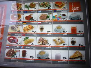 ネフスキー大通りからスパス・ナ・クラーヴィ大聖堂へ向かう途中にある、とってもモダンできれいなファストフード&カフェ、Frikadelki。東京にあるモダンなカフェと同じくらいのレベル。トイレもキレイ。席は分煙。ヨーロピアンクイジーヌの店なのだけど、ボルシチをはじめとしたロシア料理もあり、英語メニューやベジタリアンメニューもあり、かつ安い!!私はボルシチとパンとコーラ(約240円)を食べたのだけど、ボリュームたっぷりのスープで、味も良く大満足だった。ケーキ類も充実。ケーキとコーヒーで250円くらいだった。