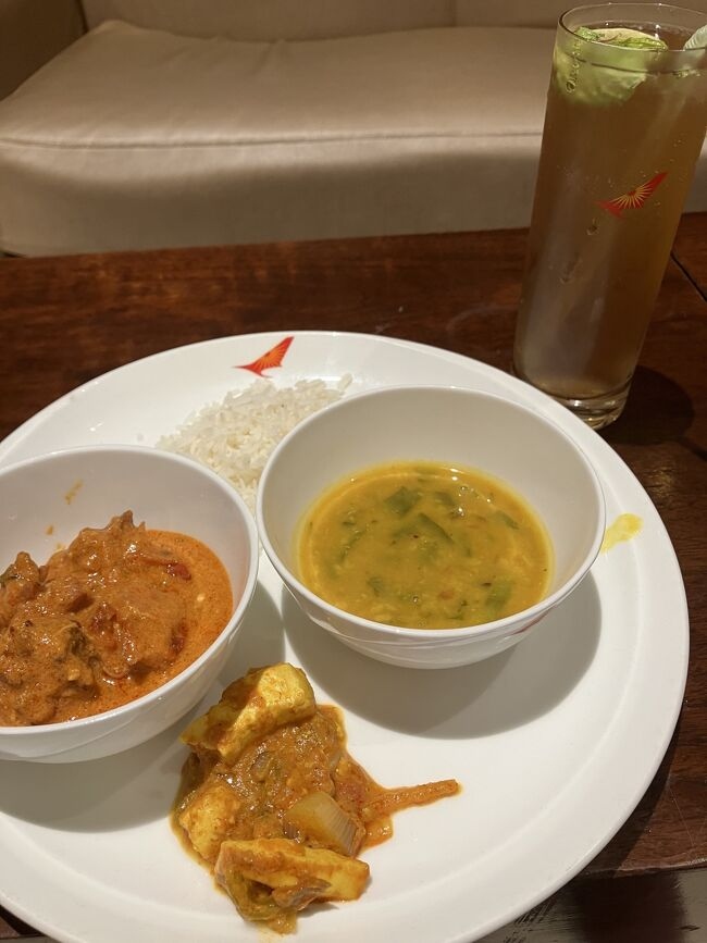 今日はランチ抜きだった(ポテチ一袋食べた)ので、カレー色々いただきます。まあおいしいけど、国内線のほうがレベル高かったような?