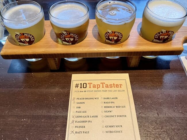 ビアフライトが13ドルと安くてびっくり。何が安いって、アメリカと違ってカナダドルは107円。アメリカじゃなくても日本に比べても安いよね?すべて地ビールで(一個はアップルサイダー)、ダークは苦手なので、IPAに変えてもらった。ラガー、ペールエール、IPA、Hazy IPA。