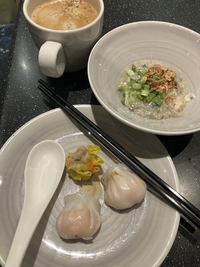 朝だったのでおかゆや飲茶などをいただきます。このエビ餃子、エビが少なくてあまり美味しくない。