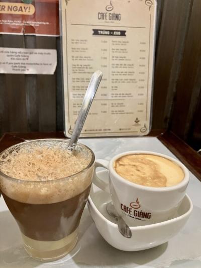 Cafe Giangというエッグコーヒー発祥の店へ。ガイドブックにもあったけど入り口が小さくてわかりにくい。けど、中は結構広く、観光客でぎっしり。席は劇せまなので、飲んだら出ていく感じかも。さっきのおしゃれカフェに比べて随分とリーズナブル。