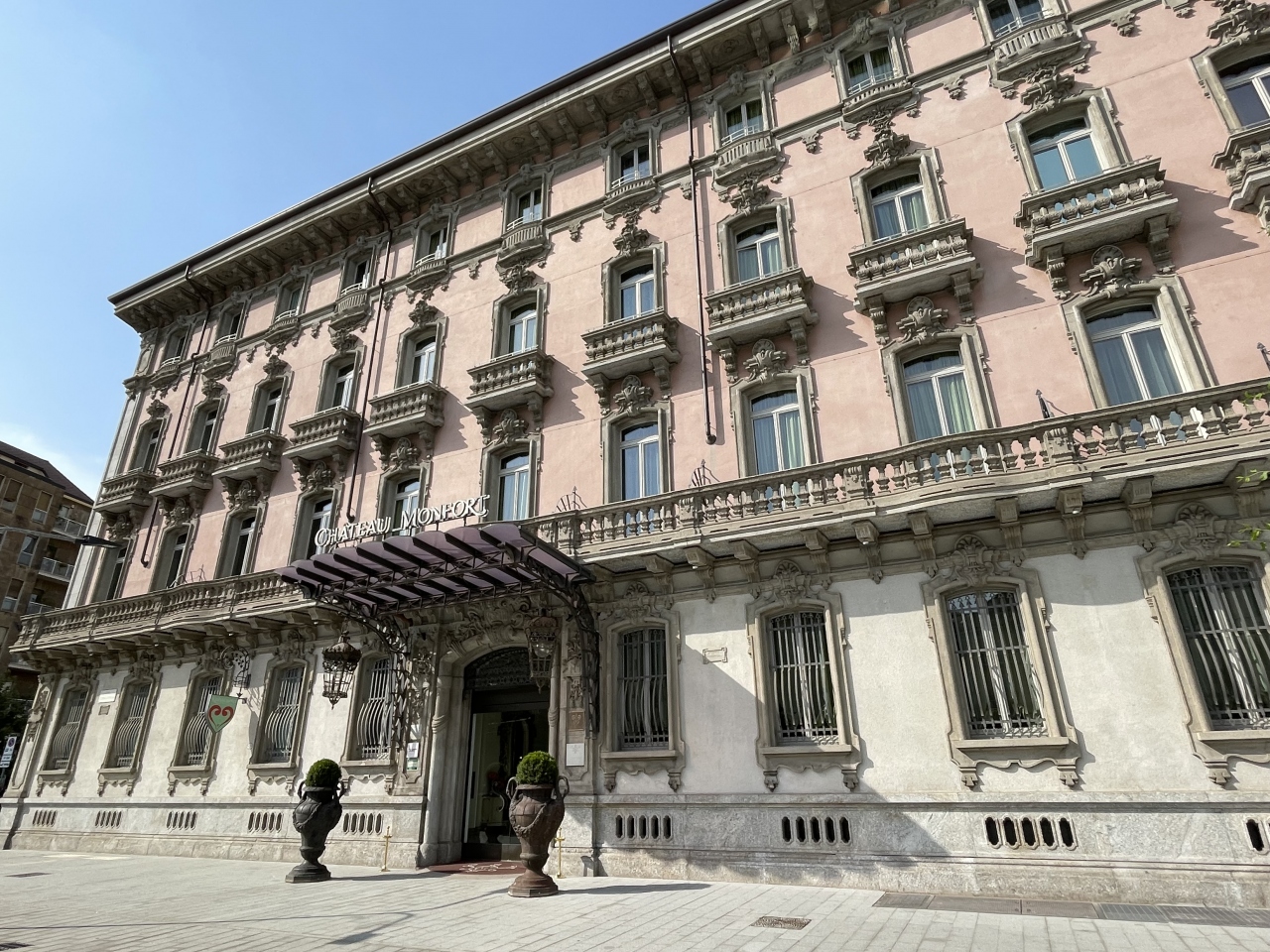 地下鉄トリコロール駅近くにあります。ホテル前の歩道の工事も終わり広々ですが、車寄せがないのでViale通り側の区画に路中です。小さくベッドのイラストが路面に描かれている2区画がホテルの駐車場ですが、私たちは一時的に駐車して荷物を預けた後にそのままレンタカー返却したので、宿泊した場合の駐車場は分かりません。。。