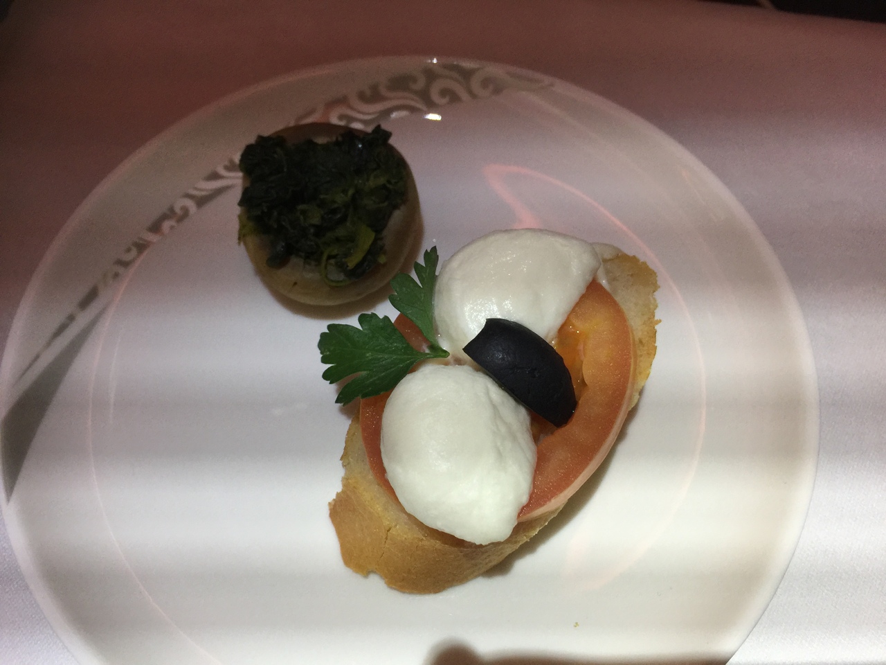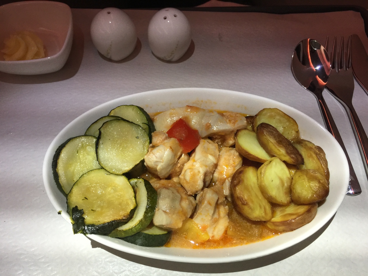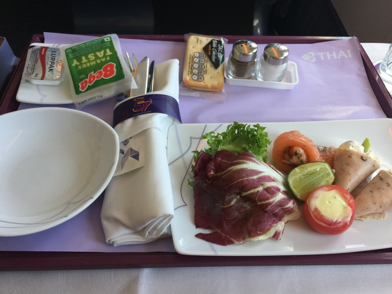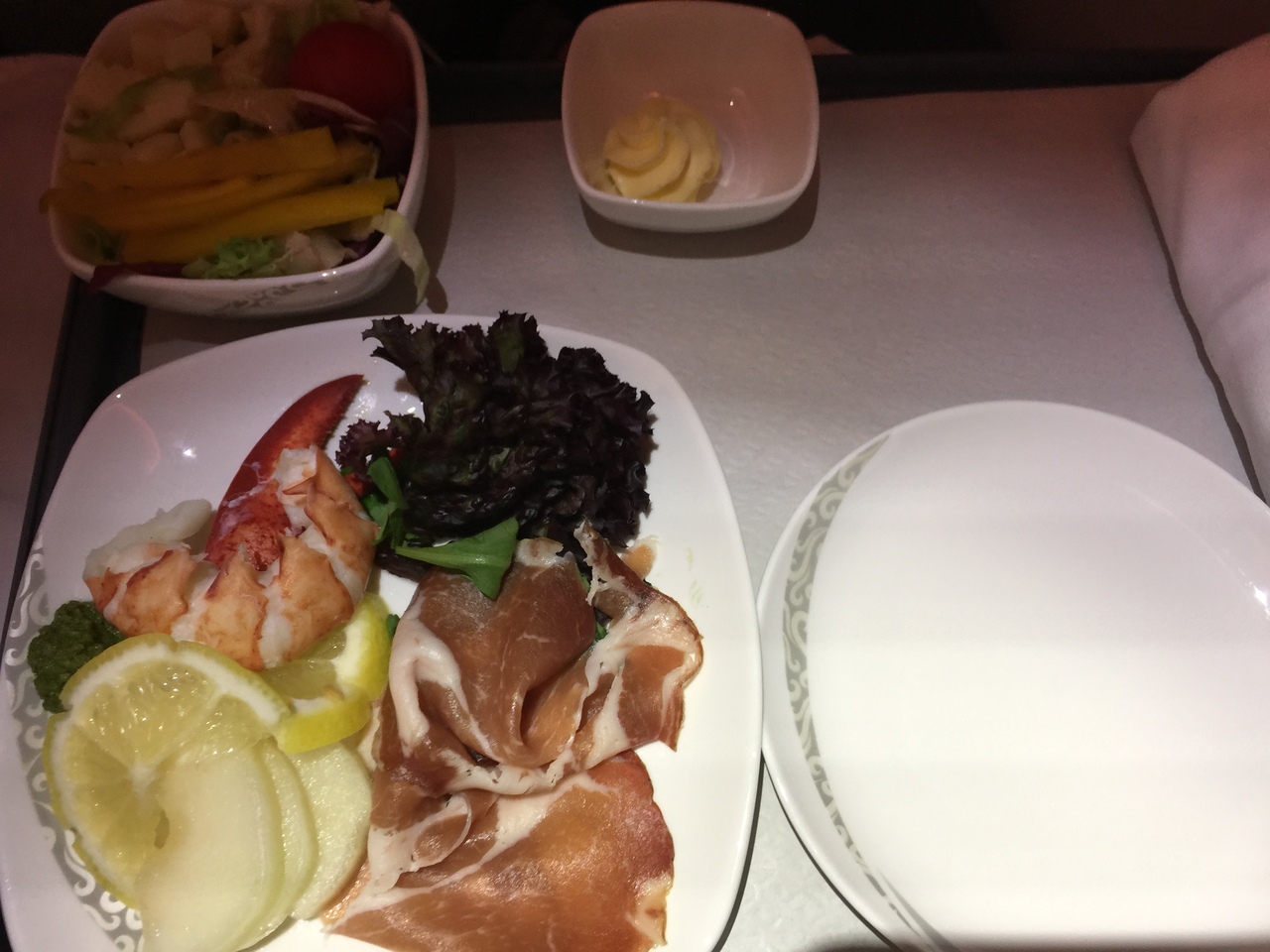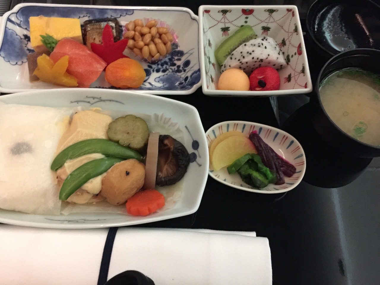 機内食が豪華!陶器のお皿でサーブされます。前菜の盛り合わせやデザートが出て来て、盛り付けも色合いも美しい。もちろん味も◎