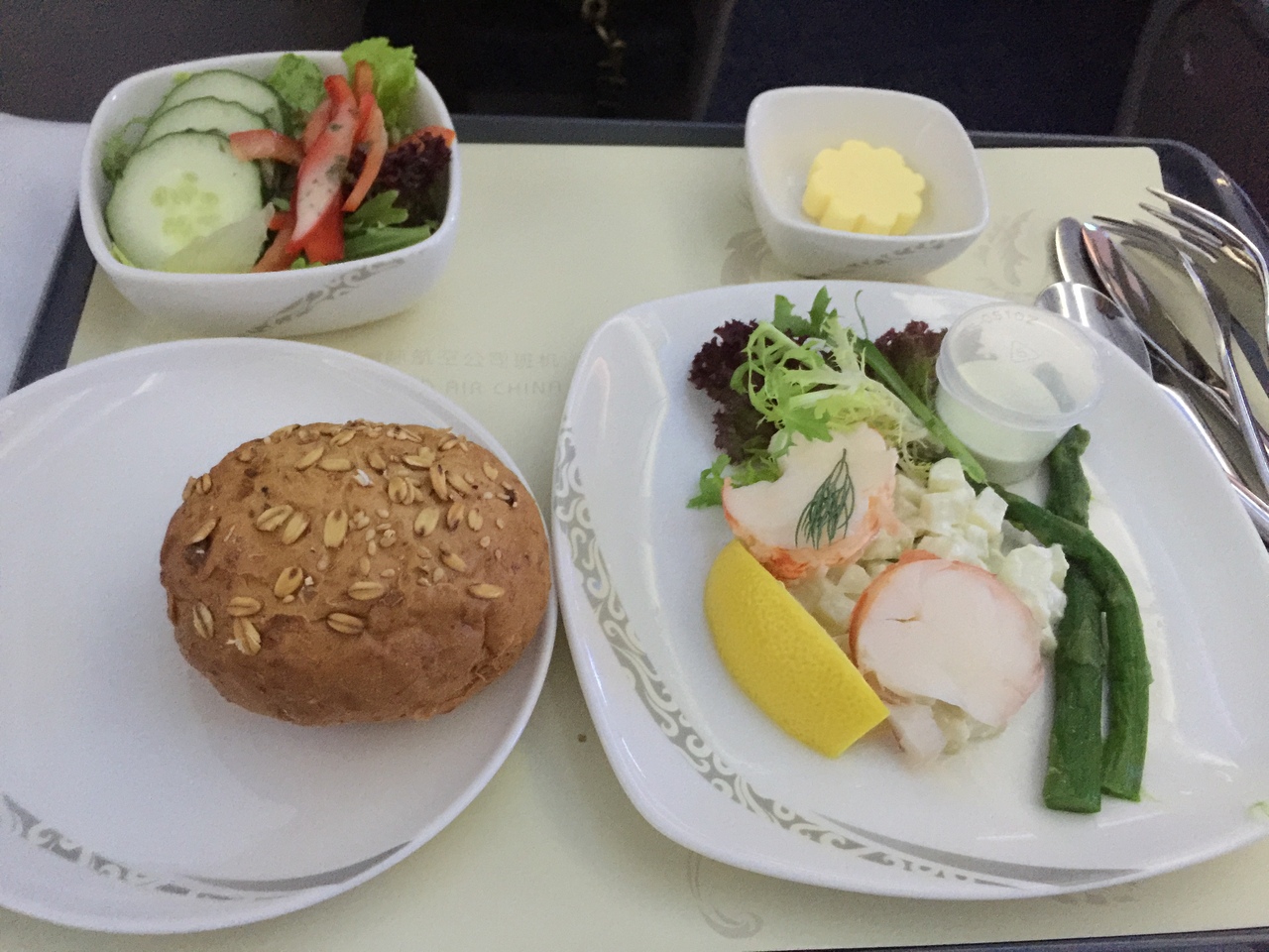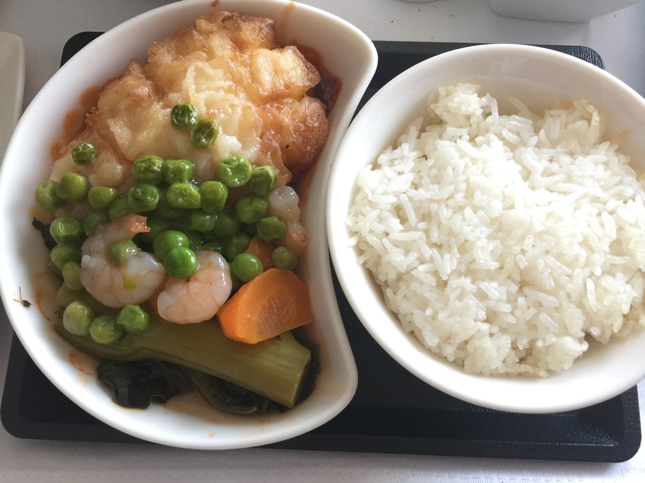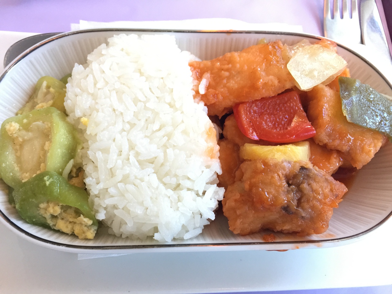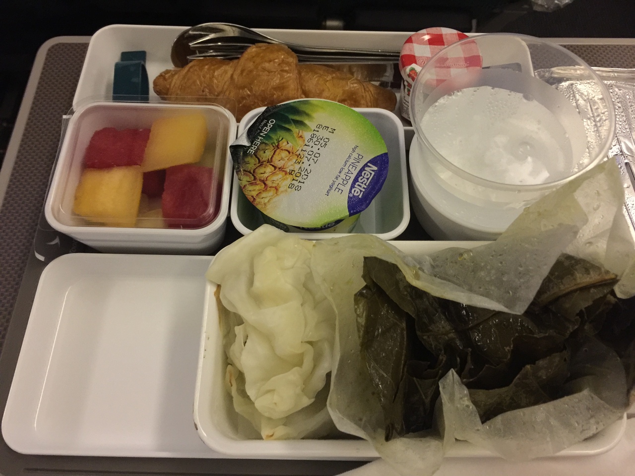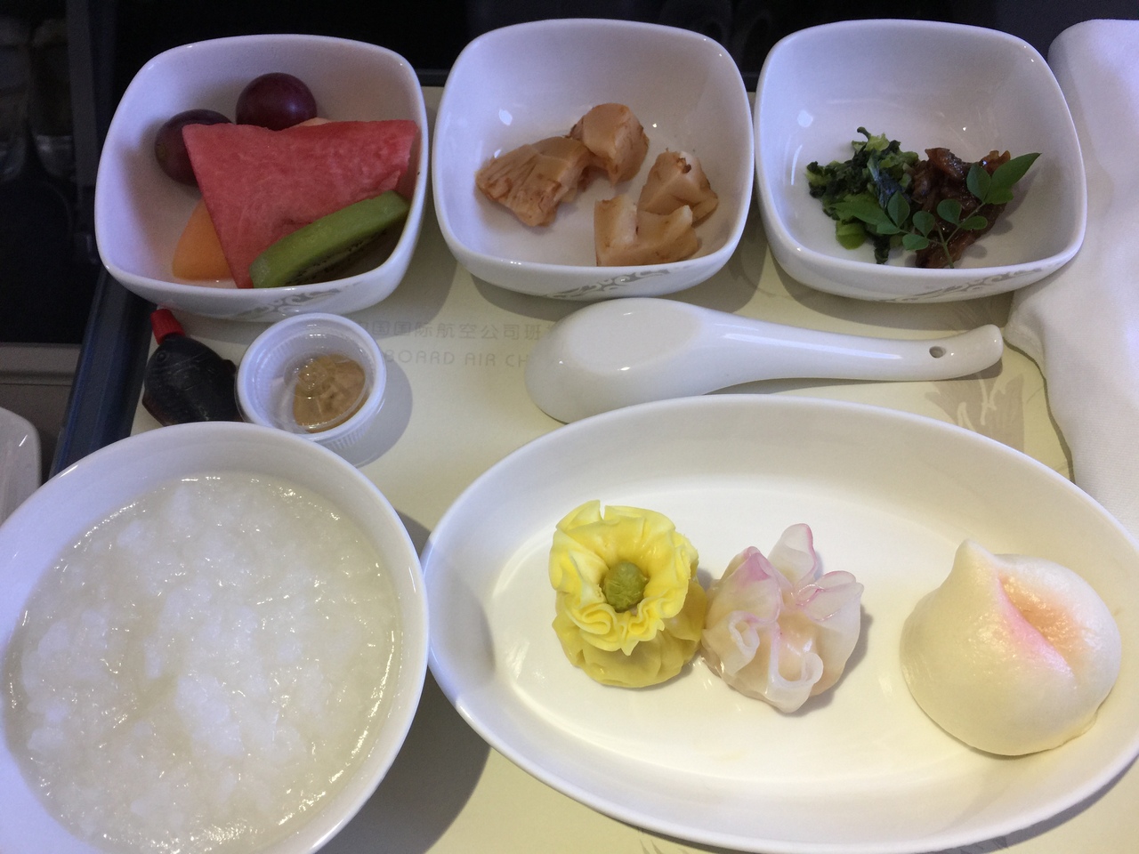 機内食は深夜便なのに夕食と朝食が提供されたようです。私は眠くて夕食をパス。朝食は点心を選びましたが、この点心が曲者で…笹の葉に包まれた黒米のおこわに、焼売らしきものが少し。この焼売たちの上に蒸す時の蓋にしたのかキャベツが1枚被せてありました。どれもお世辞にも美味しいとは言えない味でした。普通にオムレツ頼めば良かったと後悔しました。
