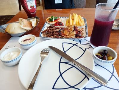 ブログなどで評判が良かったので立ち寄ってみました。大衆レストランではなく小洒落た感じのお店でした。ランチ利用でシャワルマ(焼いた薄入り肉)のプレートを注文したあと、ウエイターさんがメニューの飲み物のページを広げて当然飲み物も注文しますよね的な雰囲気。小洒落た感じのお店だしワンドリンク制でもしょうがないなと思って飲み物も注文しました。中東料理はソースや香辛料が決めてでおいしいと聞いていたので一番期待していた点だったのですが、付け合わせのフライドポテト用にとケチャップがボトルのまま提供されたのは意外でした。玉ねぎがちょこんとのったミニピザみたいなものもついてきて食べたら普通のミニピザでした。中東料理っぽかったところと言えば小皿で2種類提供されたディップソースのようなものでしょうか。フムスとガーリック風味のヨーグルトソースみたいな感じでした。お肉には清涼感のあるハーブが効いていました。気になっていたアルサファディで食事ができて満足でした。支払いはテーブルのQRコードを読み込んで行う方式になっていましたがwifiを持っていなかったのでカードで支払いました。