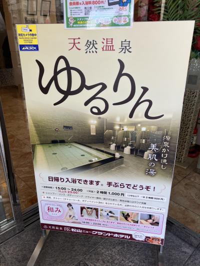 松山市内の中心部にあるアーケード街「大街道」から歩いてすぐの好立地にあるビジネスホテルです。松山城に行くにも便利です。ホテルの外観は少し古い感じでビジネスホテルらしさが感じられます。館内には天然温泉があり、15時以降であれば2時間1,000円で日帰り入浴ができるので、観光の合間に利用できてうれしいです。源泉かけ流しで美肌にも効果があるそうです。