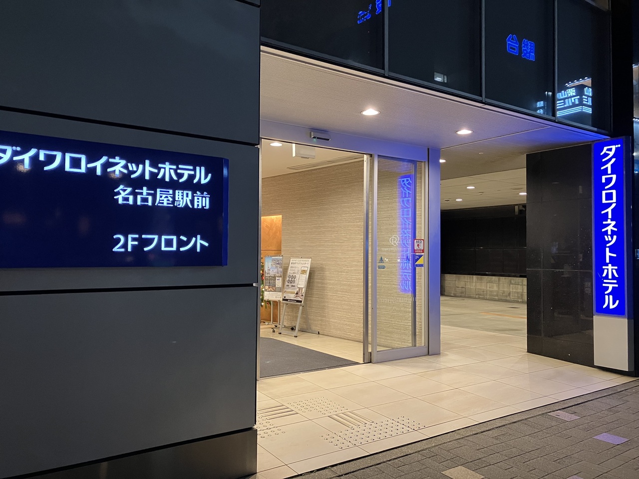 Zepp名古屋に用事があり名古屋を訪れた際にこちらのホテルを利用しました。JR名古屋駅の桜通口から歩いて10分かからない場所にあります。ホテルのある建物の1階にローソンが入っています。2階がフロントになっていて階段をのぼってアクセスします。12月だったので館内にはクリスマスツリーが飾られていました。ホテルのすぐ目の前に市バスの笹島町バス停があり便利です。