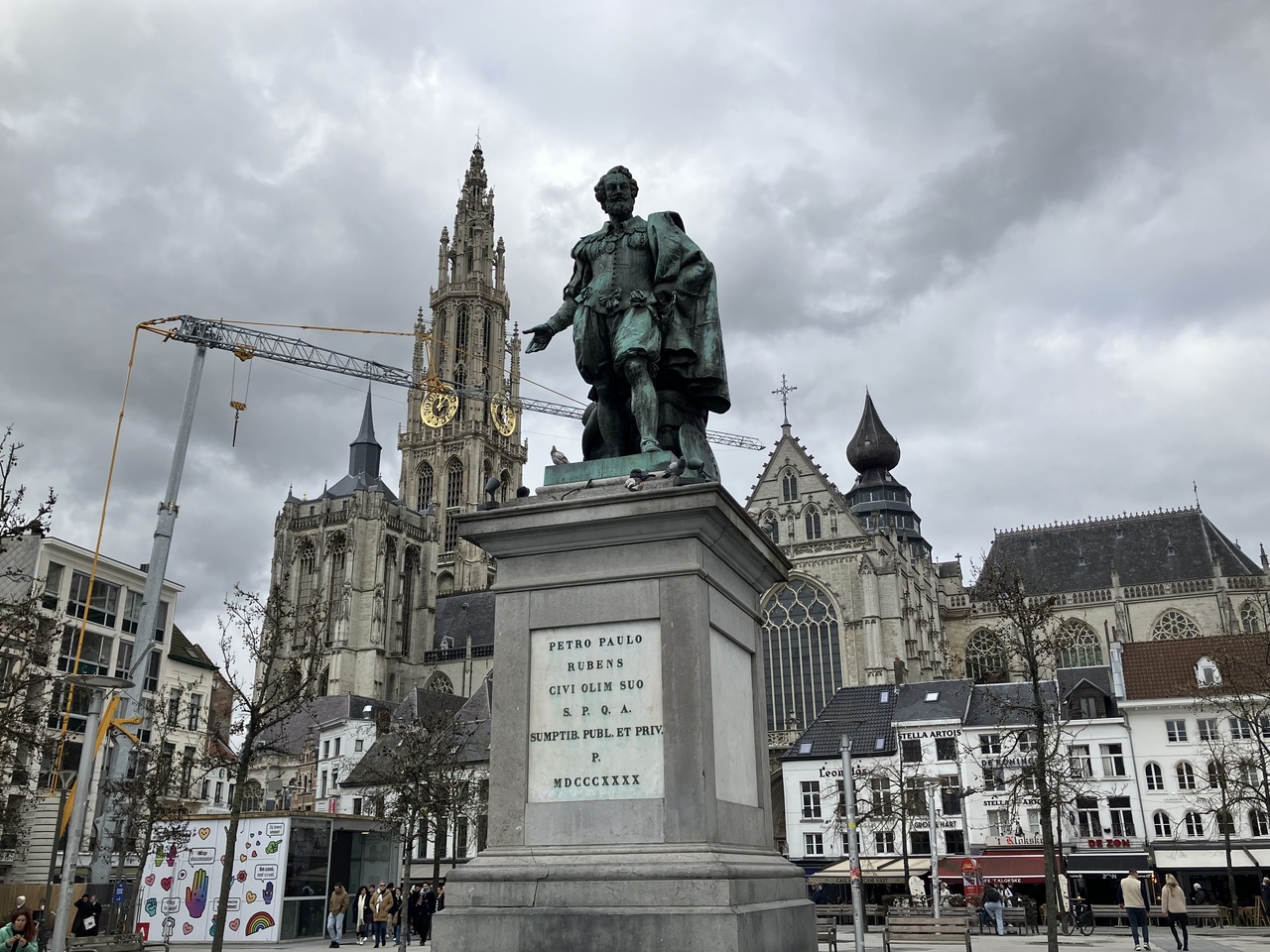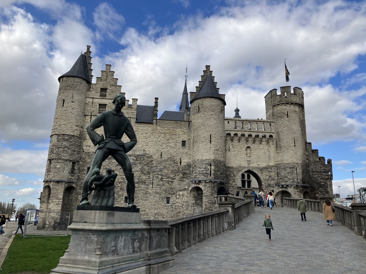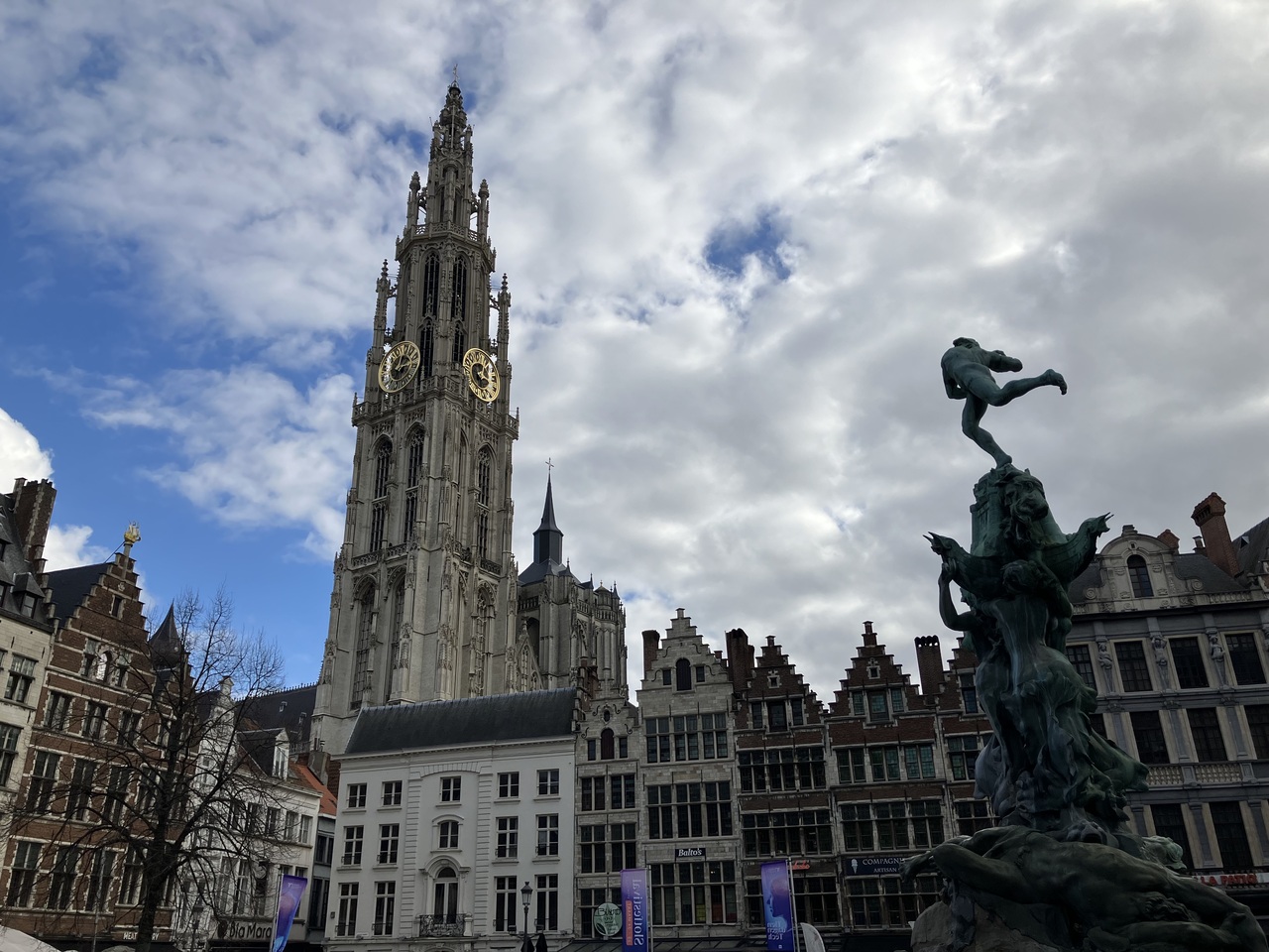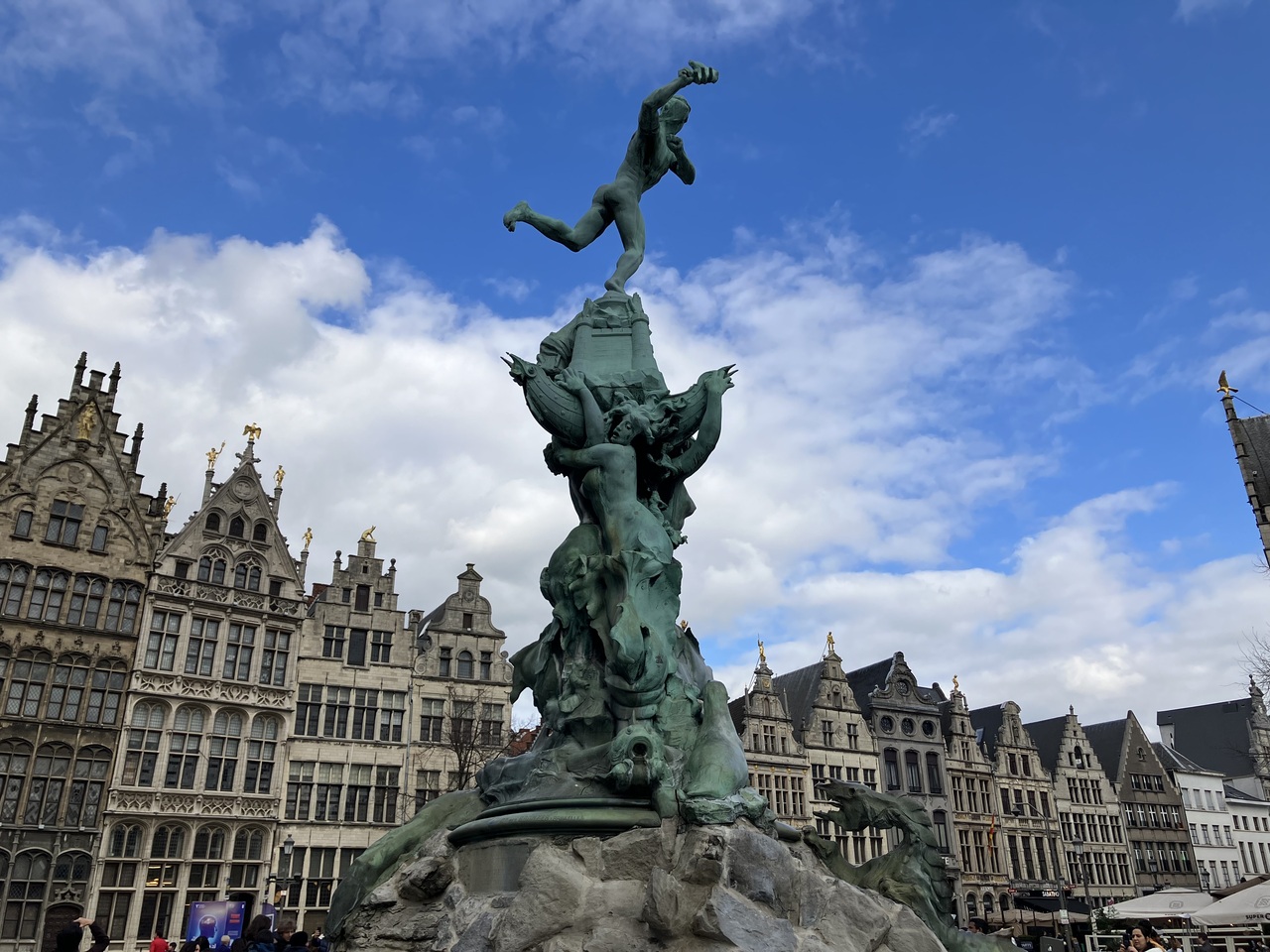 アントワープの市庁舎前の広場です。ガイドブックにこの広場で開催されているクリスマスマーケットの様子が載っていたので週末に何かマーケットが開催されているかと期待していましたが、訪れた時は何もありませんでした。広場にはブラボーの像があります。