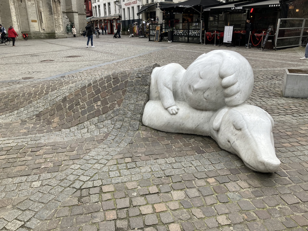 ノートルダム大聖堂の前にある広場に、「フランダースの犬」のネロとパトラッシュの像があります。ネロとパトラッシュが毛布に包まれて眠っているシーンを再現した像ですが、日本で有名なアニメの姿とは印象が異なり、より可愛らしい像です。ゲント在住のアーティストがデザインしたものだそうです。ツアーの観光客がこの像の前で写真を撮ったりしていました。