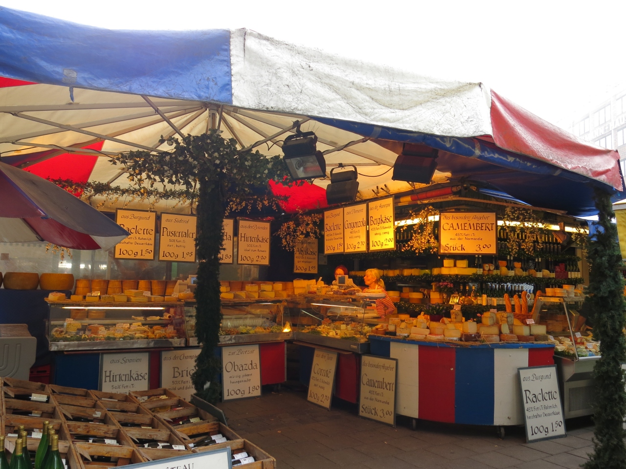 ミュンヘン滞在中にホテルの近くで青空マーケットが開催されていたので朝から行ってみました。新鮮そうなフルーツや野菜、お肉の加工品などなど。いろいろなものが売られています。ジャムの種類も豊富でお土産に買いたくなりました。市場の脇に人気のパン屋さん、ホーフプフィステライのお店もあり、ドイツパンを購入しました。