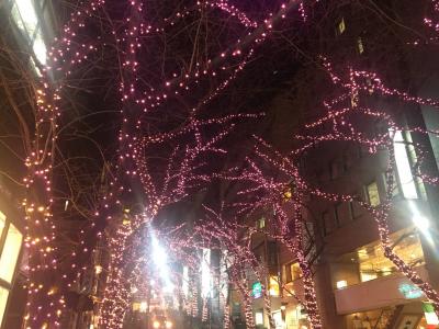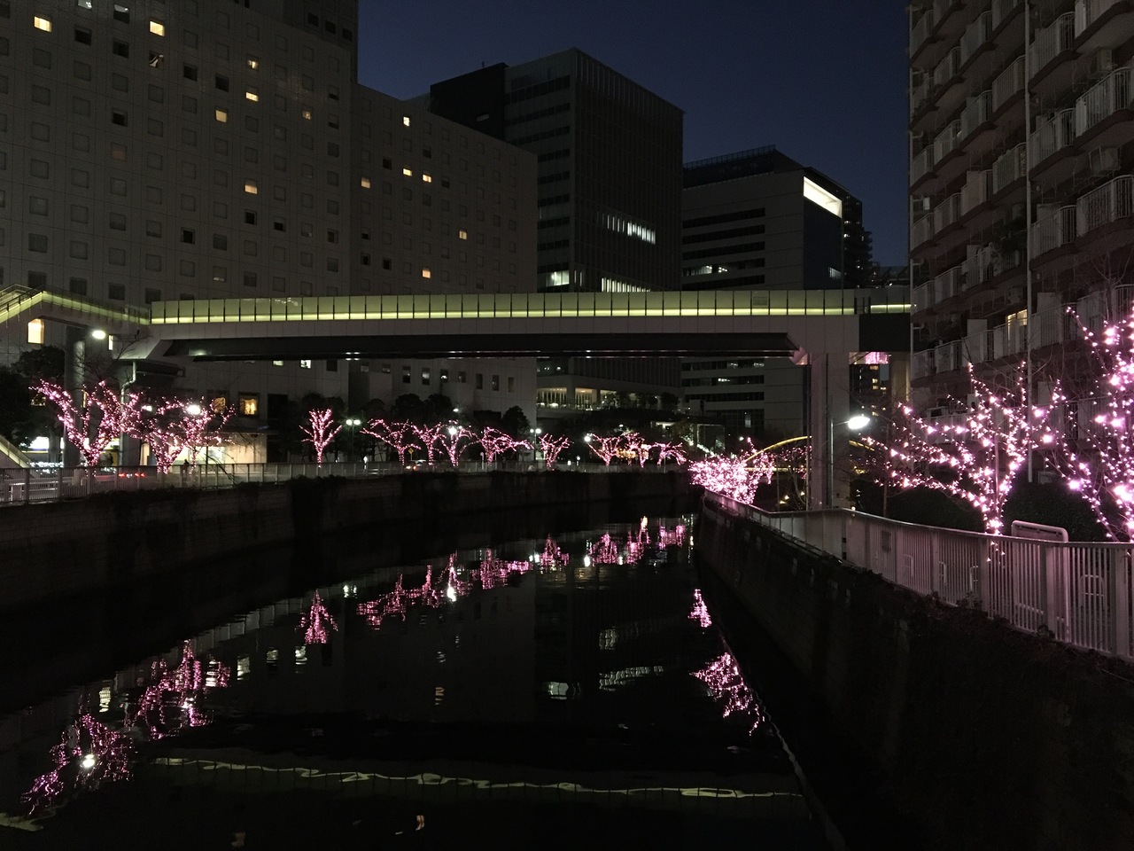 五反田から大崎にかけて、目黒川沿いの桜の木がピンク色の電飾で彩られていました。春の季節は桜が満開になって、目黒川とヒラヒラ花びらが舞い散る桜の光景を楽しむことができますが、冬にもイルミネーションで美しいです。「冬の桜」をイメージしているそうですが、宝石のようにキラキラと綺麗です。通りかかった人たちも足を止めて写真を撮っていました。