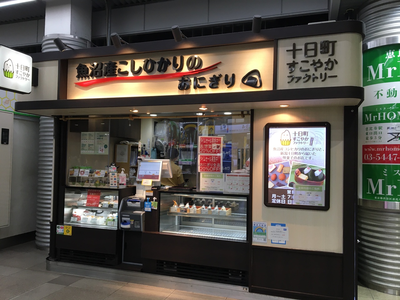 JR恵比寿駅の東口方面の駅構内にあるおにぎり屋さんです。新潟県魚沼産のお米を使ったおにぎりや米粉を使ったパウンドケーキなどが売っています。平日の18:30頃訪れたところ、おにぎりは3種類しか残っておらず、20%割引のタイムセールになっていました。玄米おにぎり(200円)を購入しました。シンプルなおにぎりですが、お米が美味しいので安心して食べられます。