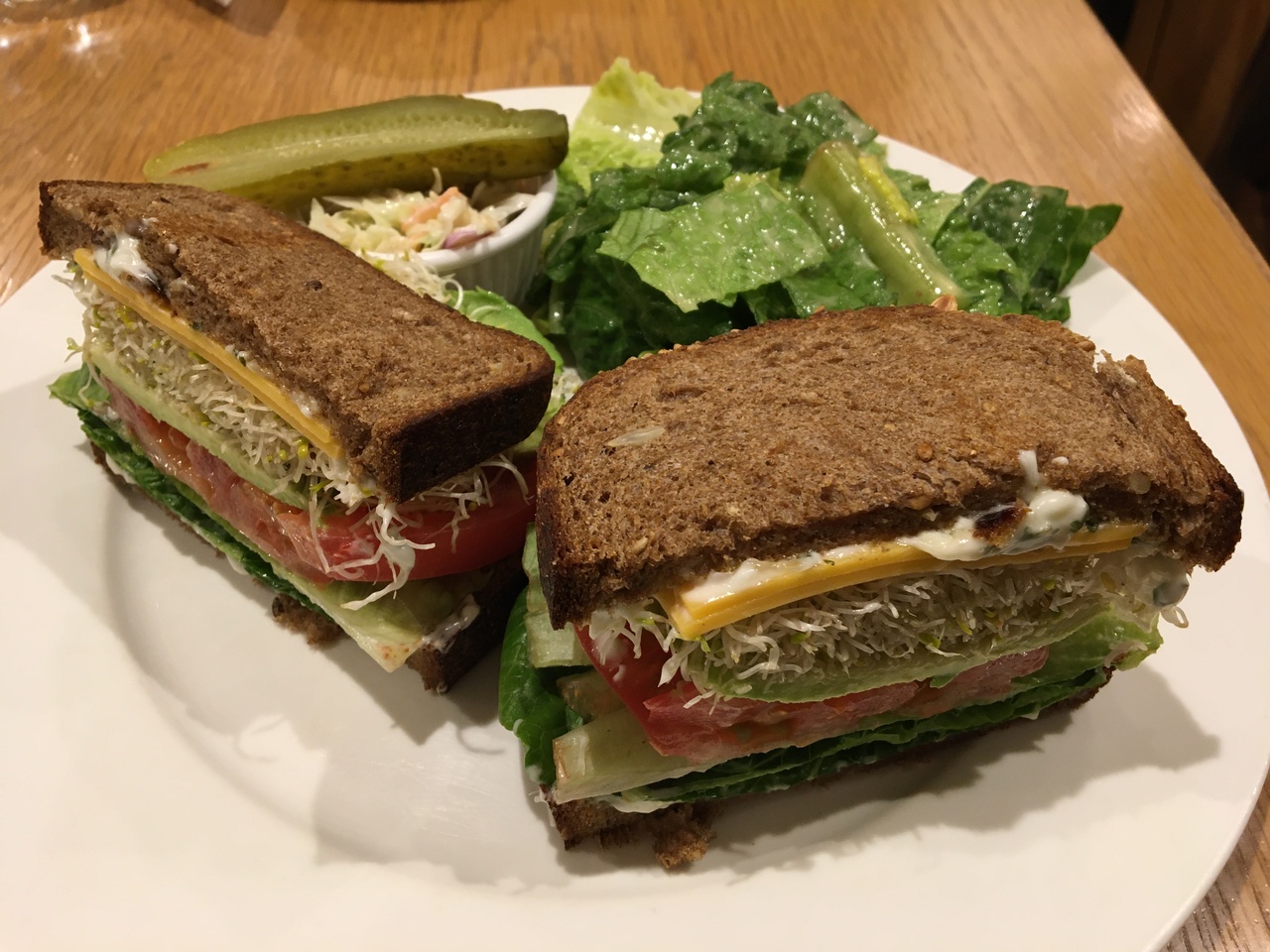土曜日の夕方、根津美術館で美術鑑賞の後立ち寄りました。17時のラストオーダー前に滑り込んだので、すぐに座れました。螺旋階段を上って2階の席へ。大きなテディベアのぬいぐるみがソファに座っていました。ベジタブルサンドイッチ(1200円)とホットコーヒー(600円)をオーダーしました。コーヒーはお代わり自由で、なくなると注いでくれます。サンドイッチはボリュームたっぷり。ライ麦パンが香ばしくて美味しかったです。