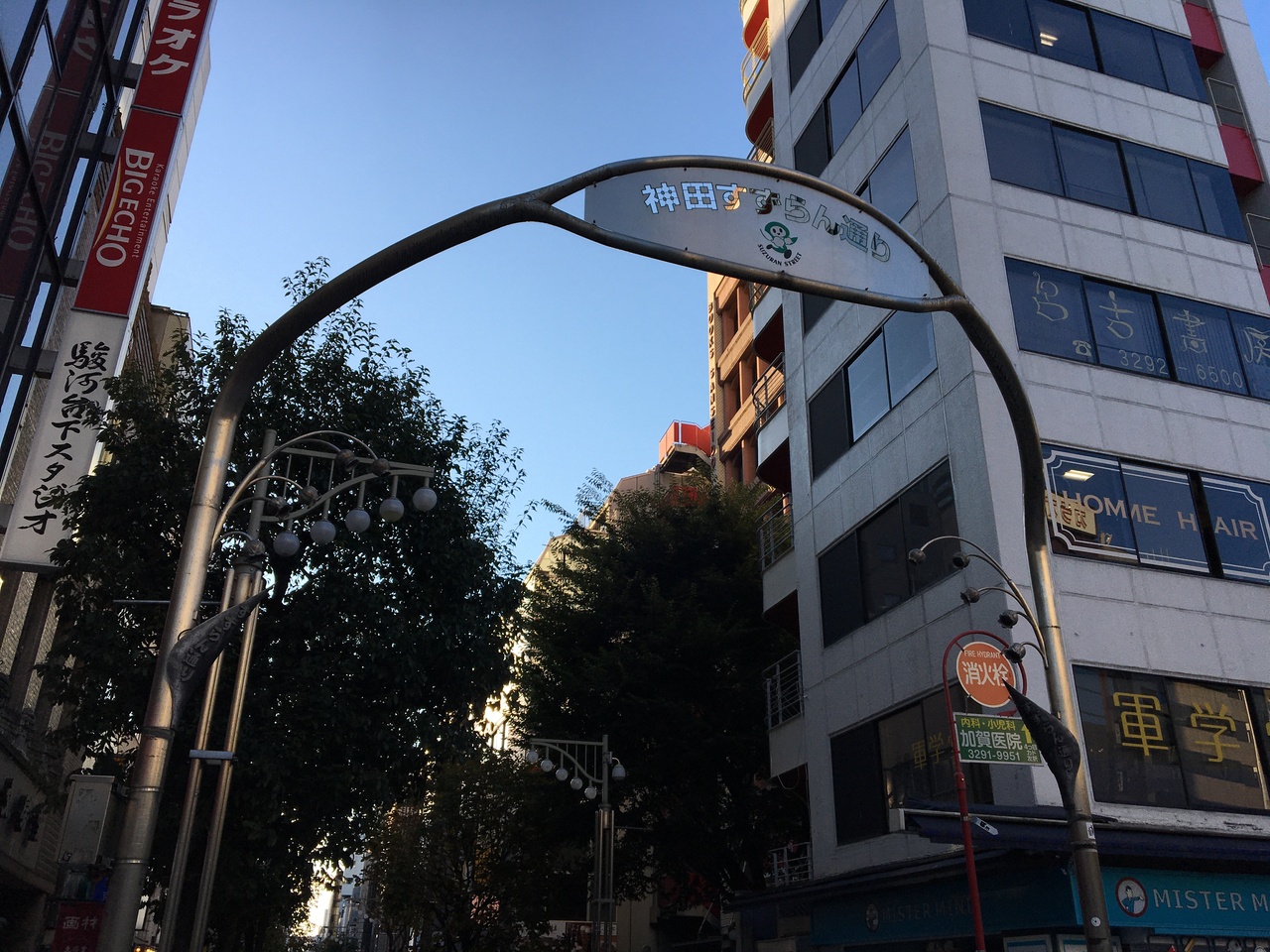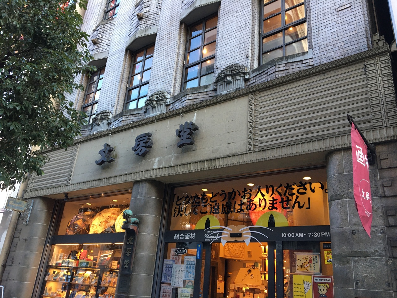 靖国通りを歩いていたら、すずらん通りと書かれたゲートが目に留まりました。すずらんのモチーフが付いていて、可憐な雰囲気があり、この通りを歩いてみることにしました。靖国通りからほど近いところに、レトロな雰囲気の建物があり、画材や文房具を販売する専門店の文房堂でした。他にも、アジアに関する本を扱う書店などもありました。