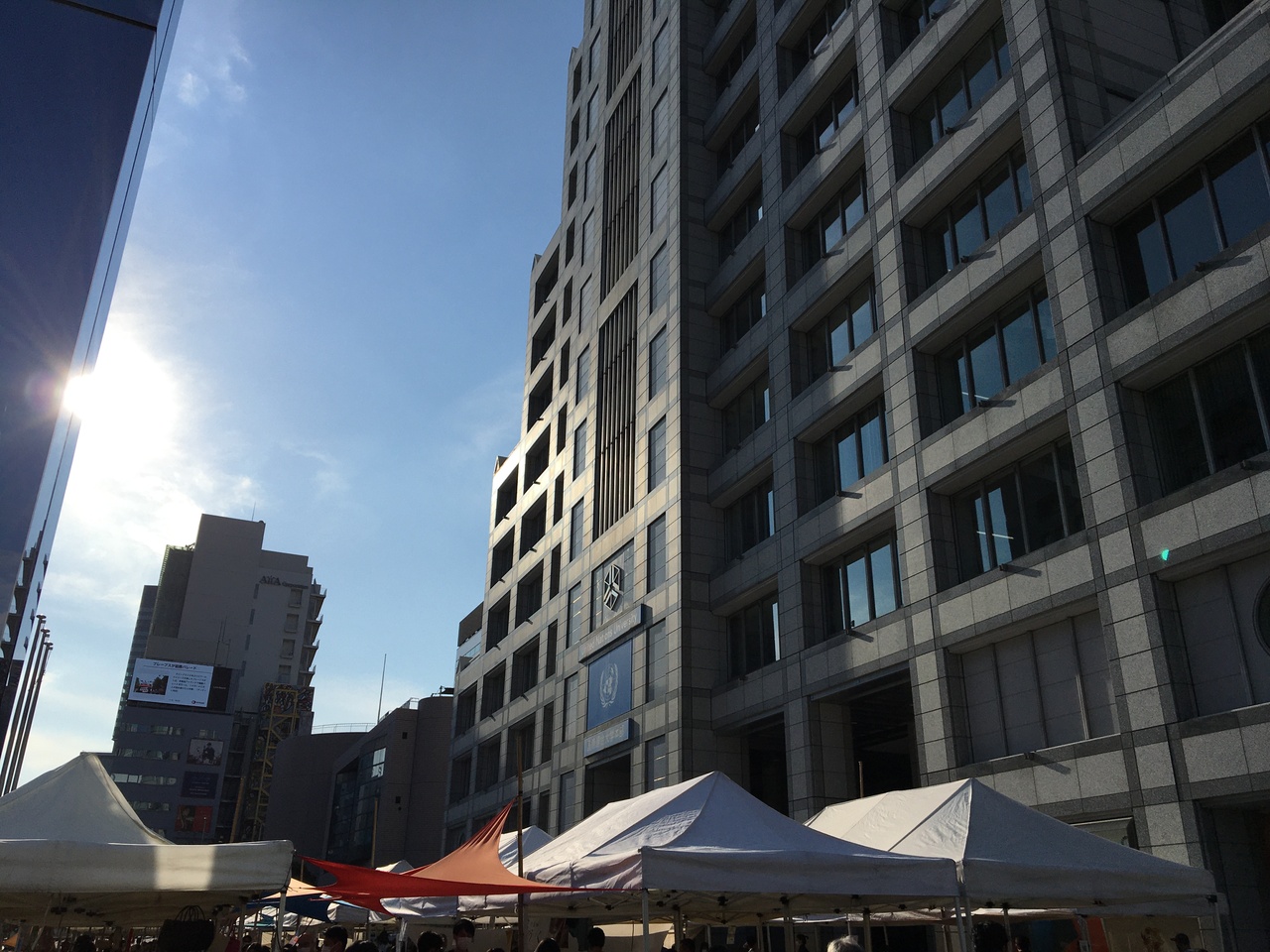 土曜日の午後、渋谷から宮益坂を上って青山の国連大学前で開催されているファーマーズマーケットに行きました。野菜やハチミツ、パンなどの食べ物以外に、骨とう品や手作りのアクセサリーを販売しているエリアもありました。みんな笑顔でフレンドリーなので、買い物をする時のコミュニケーションも楽しいです。