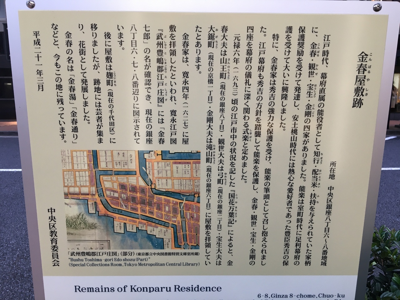 新橋駅に近い、御門通りを歩いていた時に、「金春屋敷跡」と書かれた説明版を見つけました。江戸時代に幕府直属の能役者として認められていた四家(金春・観世・宝生・金剛)のうち、金春家の屋敷があった場所だそうです。今は屋敷はなく、案内板だけがこの場所の歴史を伝えています。