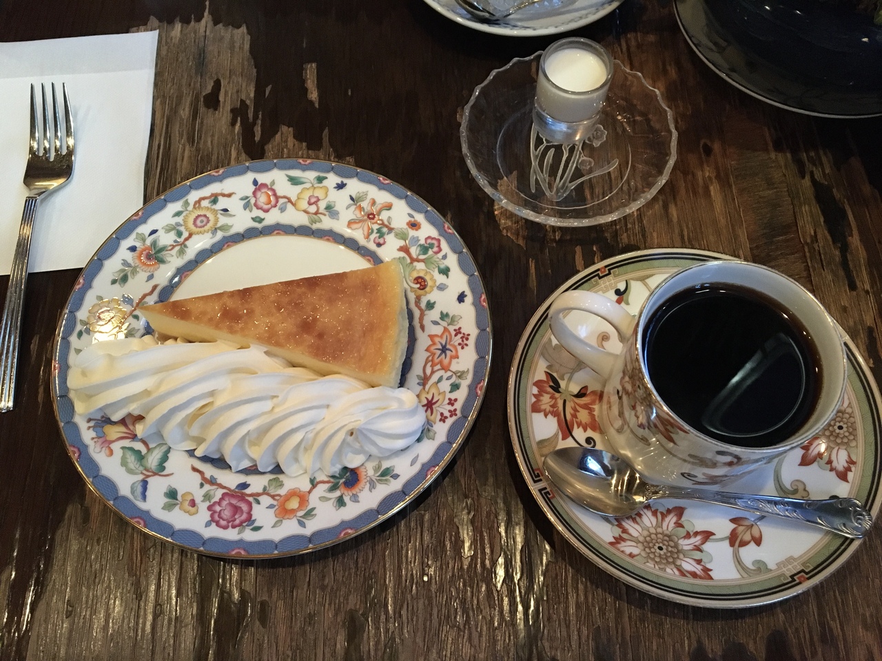 ケーキセット(950円)を注文。ケーキは3種あって迷ってニューヨークチーズケーキをチョイス。コーヒーは苦味の強いのとマイルドなのと2種類があるとのことで、マイルドな方にしました。ウェッジウッドのお皿とカップでサーブ。チーズケーキは唸るほど美味しかったです。クリームも甘すぎず絶妙で、ずっと食べていたいほどでした。コーヒーとの相性もバツグンで至福のひと時でした。次はレアチーズケーキも食べてみたい!- 旅行時期