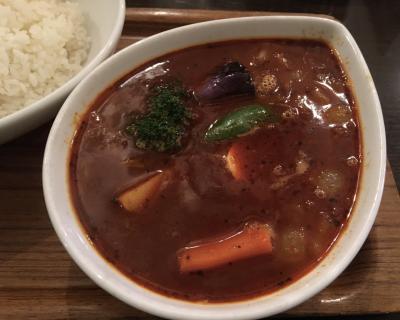 スープ、具、辛さが選べます。たっぷりの野菜と国産鶏の手羽がベースという赤のスープで、野菜カレー(900円)をオーダーしました。ジャガイモ、にんじん、ピーマン、ナスなどの野菜や茹で卵が入っていてボリュームがあります。