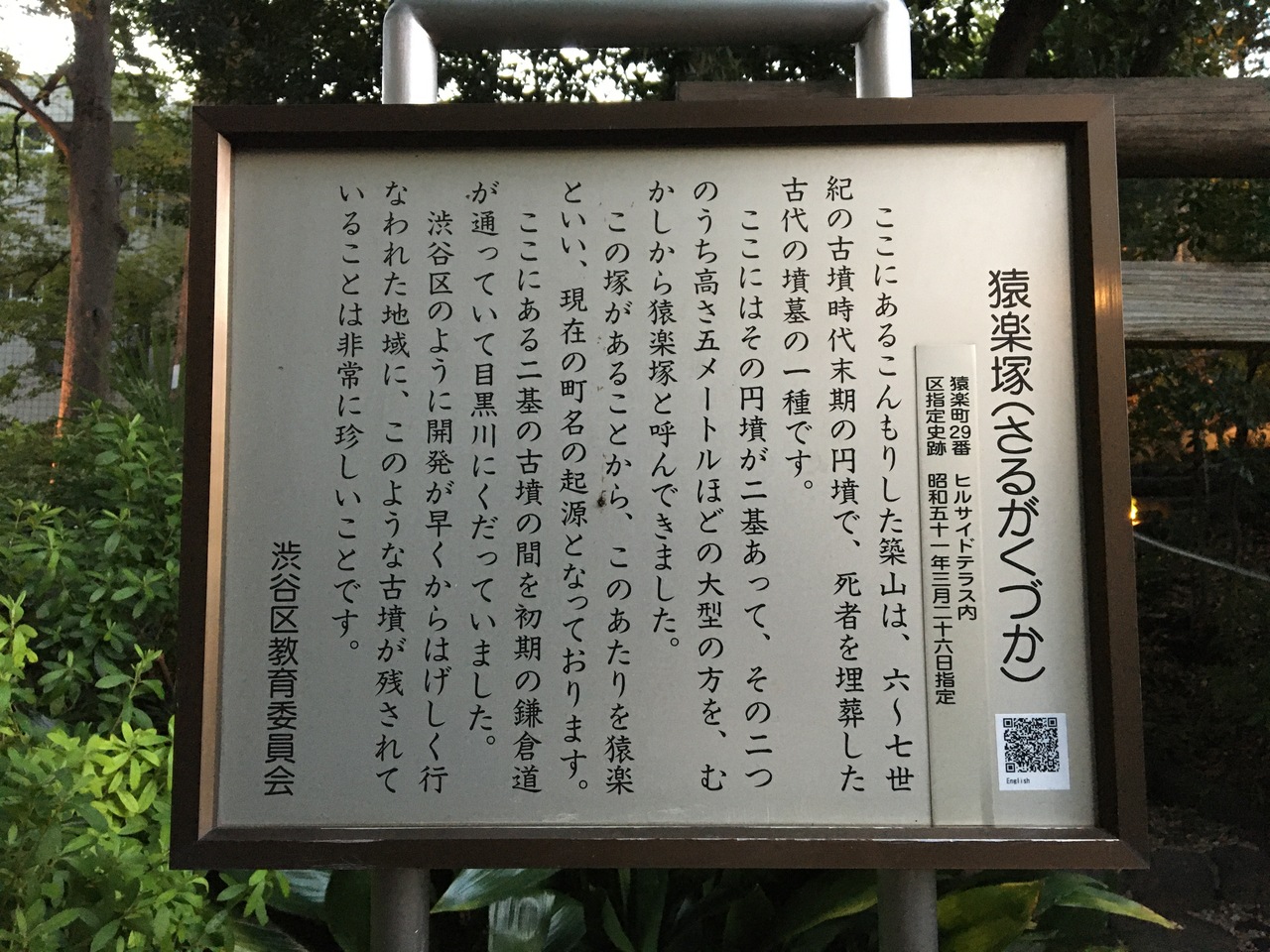 旧朝倉家住宅を見学した後、猿楽塚方面の出口から出てこちらに向かいました。代官山ヒルサイドテラスの中にあります。道順の案内があるので、迷うことはないですが、まさかこんなところに古墳があるとは思わなかったので、不思議な場所に迷い込んだような気分になりました。6~7世紀の古墳時代末期の円墳で、死者を埋葬した古代のお墓の一種だそうです。
