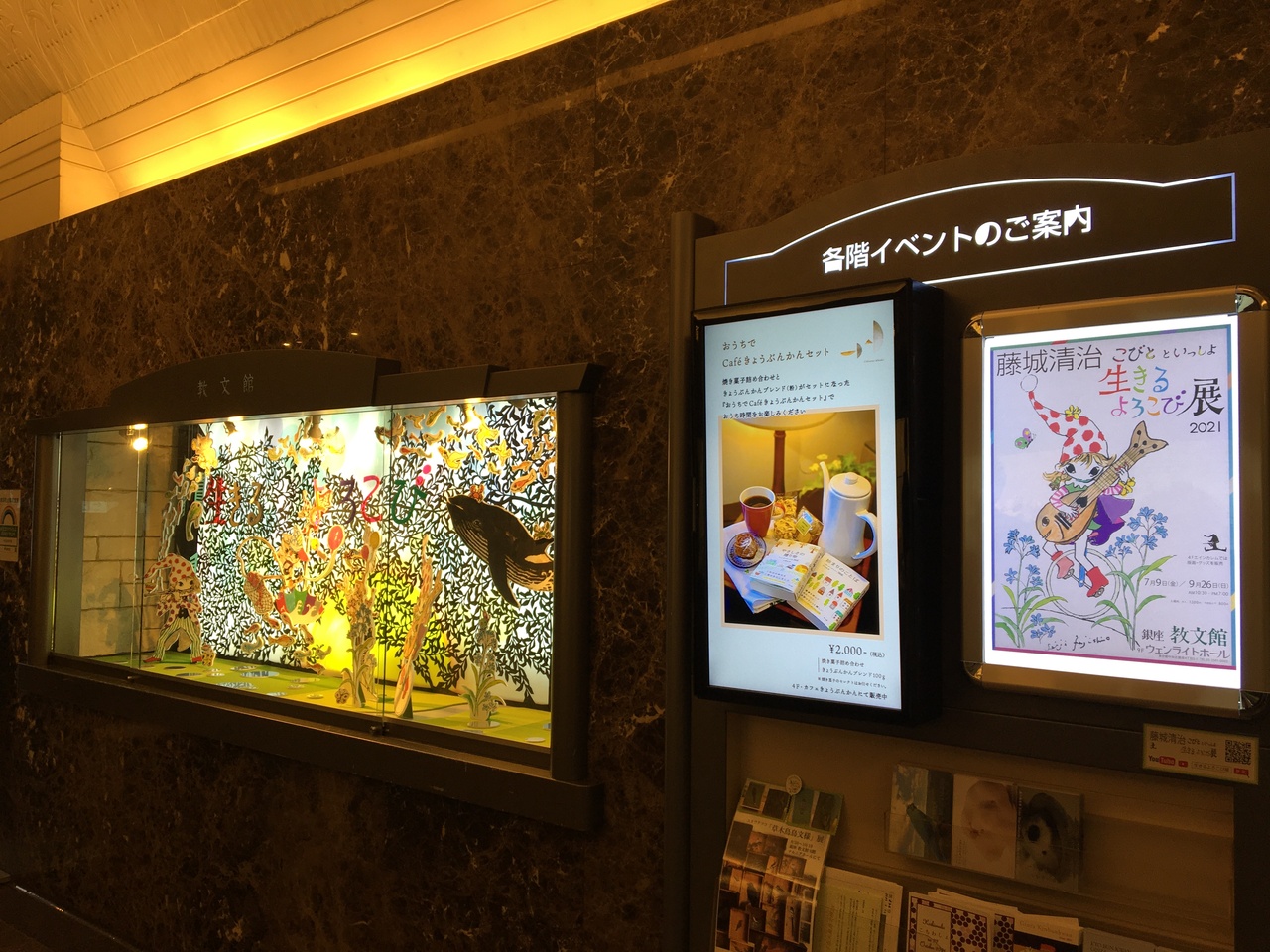 6階にはナルニアホールもあり、訪れた時はイラストレーターのユカワアツコさんの鳥のイラストが展示されていました。4階にカフェとショップがありました。- 旅行時期