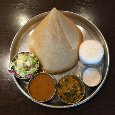 土曜日の13時前に来店。雨の日だったので空いていました。一階は喫煙席だったので二階へ。本日のカレーは3種類ありましたが、ほうれん草と豆のカレーに惹かれたので、ドーサとカレー一種類のセット(1180円)を選びました。三角錐の形に巻かれたクレープの中に、じゃがいもの炒め物があって、プレゼントを開ける時みたいなワクワク感がありました。