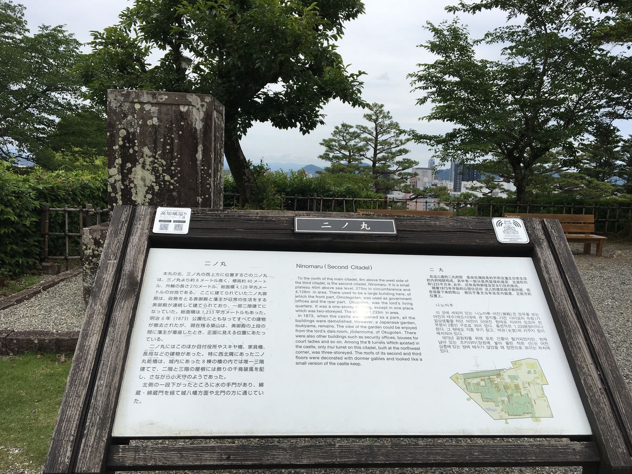 高知城を散策。三ノ丸からさらに進み、詰門を通り過ぎた先にあります。三ノ丸と同じく、現在は建物は残っておらず、広場になっていて国旗がはためいていました。説明を読むと、この二ノ丸の造りも考えられていて、攻めあがってきた敵が簡単に通り抜けられないように防衛上の配慮がされていたとのこと。ここから天守まで、もうすぐです。