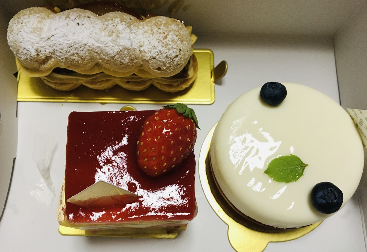 甘いイチゴとバニラの香りが絶妙なフレジェ、レアチーズとブルーベリーのケーキ、パリブレストを買いました。モンブランも人気とのことです。可愛い猫がデザインされたクッキー缶も気になりました。- 旅行時期