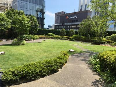 歌舞伎座タワーの5階にある小さな庭園です。入場は無料で、誰でもフラッと立ち寄れる癒しスポット。落ち着いた雰囲気で、歌舞伎座の大屋根を珍しい角度から眺めることができる写真スポットでもあります。庭園脇にある赤い階段を下りていくと4階に出ることができます。
