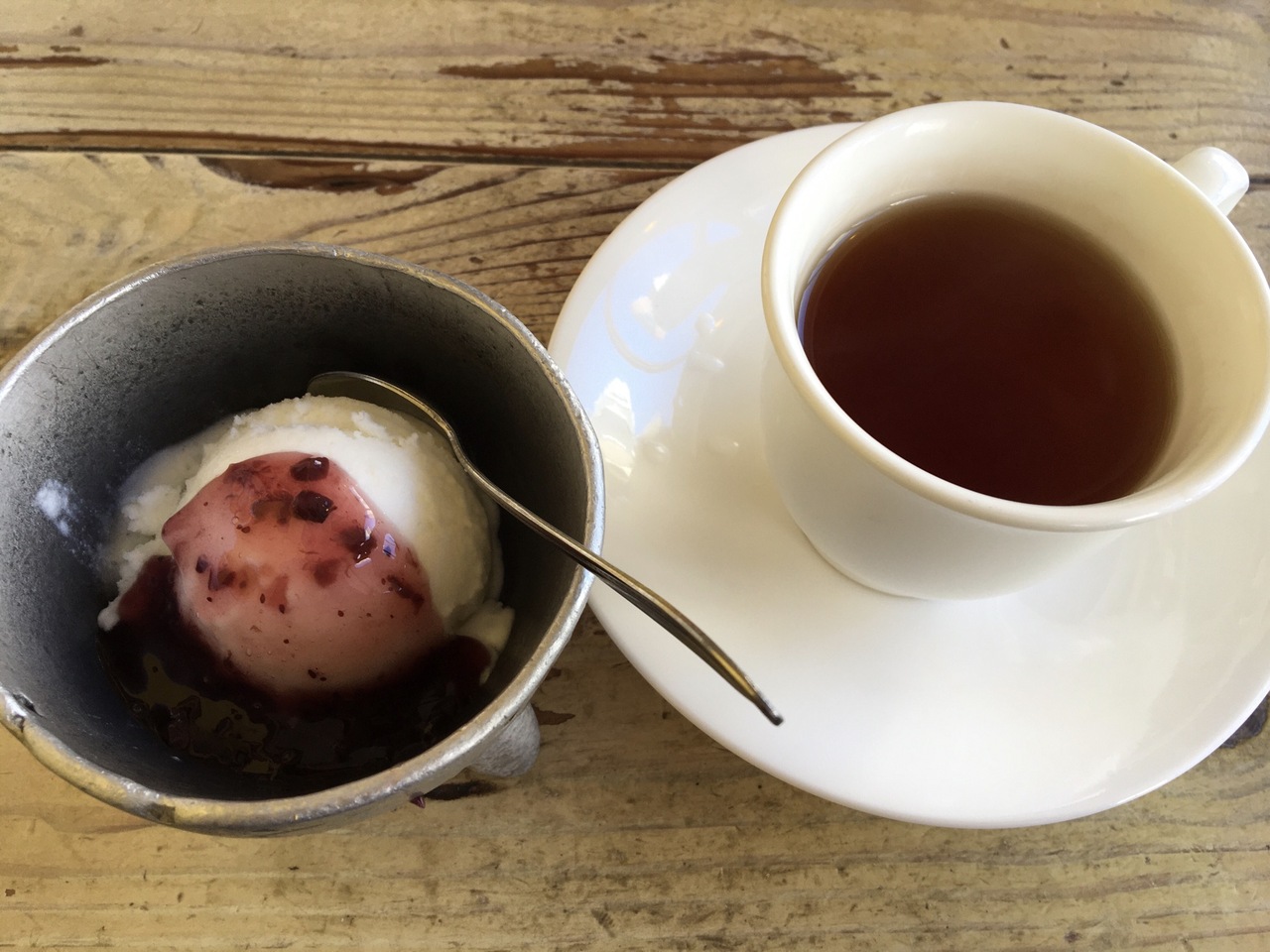 ランチのスリランカカリー(990円)を注文。サラダ、アイスクリーム、紅茶が付いてきます。カレーはサラサラとしたスープ状。チキンとポテトカレーの2種類だそうで、具がごろっと入っています。カレーは辛めで食べ進めていくと火を吹きそうでしたが、食べ進めていくと慣れてきました。
