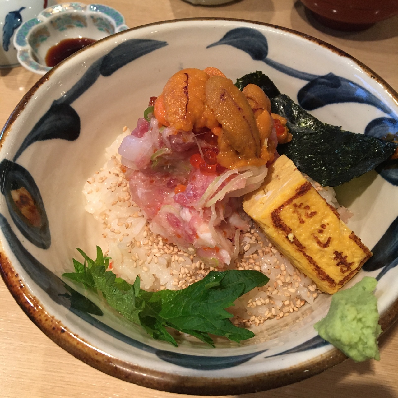 銀座コリドー街から一本道に入ったビルの5階にあります。少し分かりくいのですが、店内は満席。人気店です。握りのお寿司や海鮮丼があり、海鮮丼をオーダーしました。マグロやウニなど具がたっぷりで大満足でした。- 旅行時期