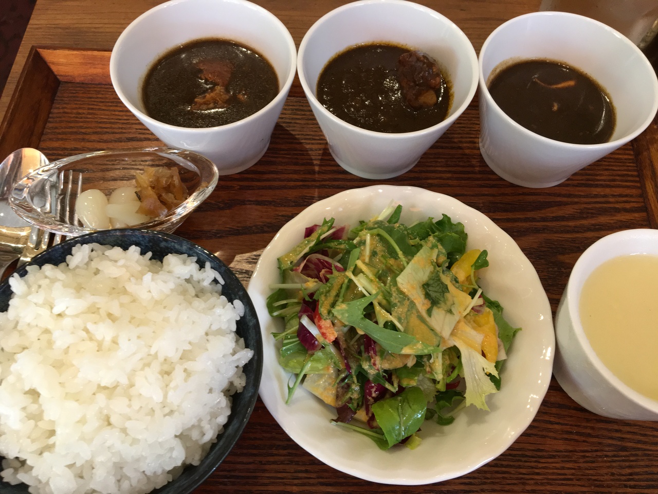ビーフは甘口で野菜や果物の旨味が濃縮さろたかんじ、ポークとチキンはスパイシーでした。- 旅行時期