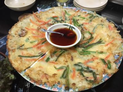 チヂミもお皿の上の大輪の花のように芸術的。