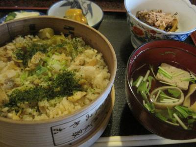 ランチはセットになっていて、ベーシックな深川めしセットを注文しました。小鉢がついてきます。