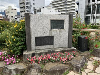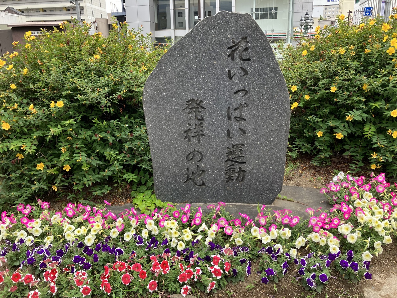 女鳥羽川に架かる千歳橋のたもとに、色とりどりの花々が咲いている中に「花いっぱい運動発祥の地」と書かれた大きな石碑を見つけました。この運動について初めて知ったので調べてみたところ、戦後まちが荒廃していた頃に花を通じて人々の気持ちを豊かにしたいとの願いを込めて昭和27年に松本市の小学校教員だった方が始められたとのことです。今も松本の街が美しいのは、その心意気が受け継がれているからかと感じました。
