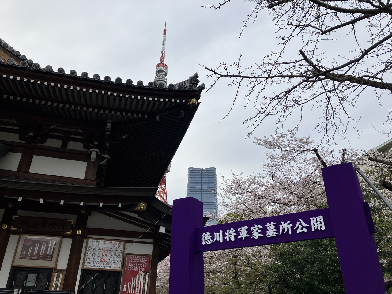 桜の季節に増上寺を訪れました。増上寺は徳川将軍家との縁が深いお寺で、二代将軍秀忠をはじめ、代々の将軍が埋葬されています。本殿の右奥に進んでいくと「徳川将軍家墓所公開」と書かれた紫色のゲートがありました。奥には東京タワーも見えました。