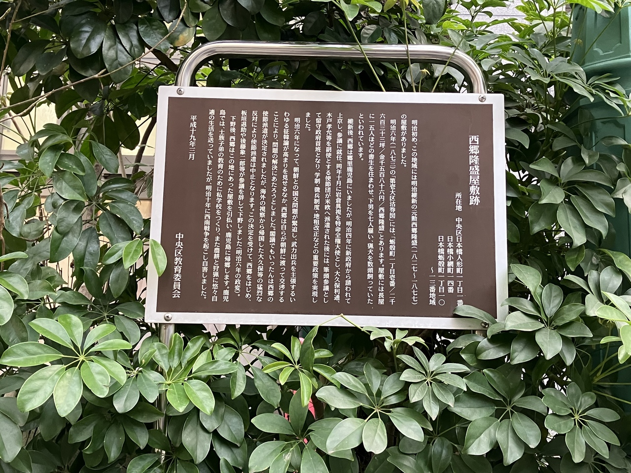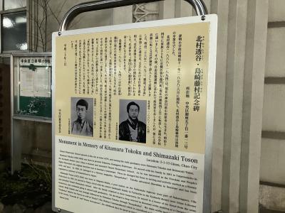 有楽町・銀座エリアにある泰明小学校の前は何度も通っていたのですが、この案内板があったことに気付いていませんでした。案内板によると、泰明小学校は明治11年に開校し、北村透谷と島崎藤村は初期の卒業生だったとのことです。日本の近代文学の2人の偉人がこちらの出身だったとは歴史を感じました。