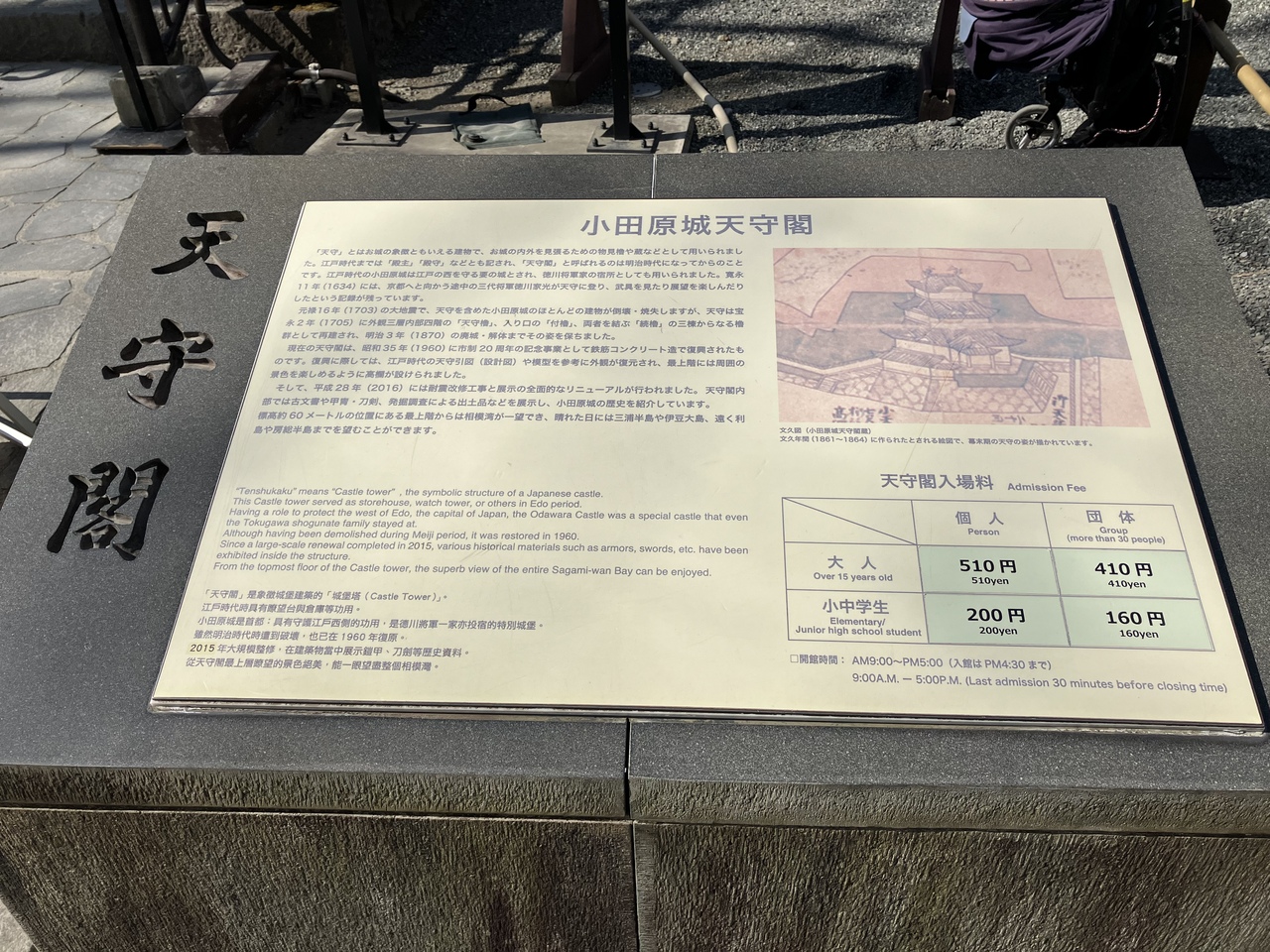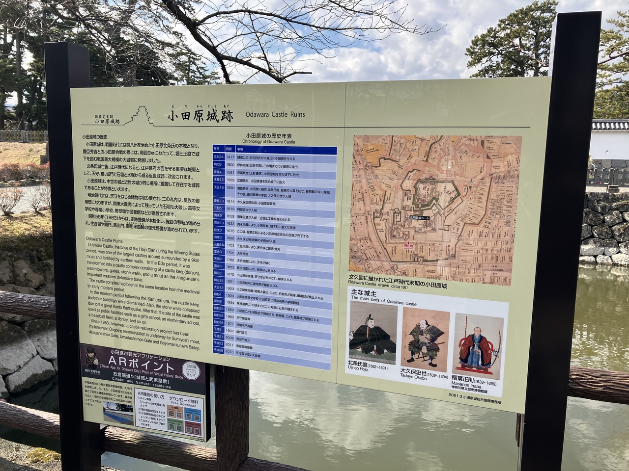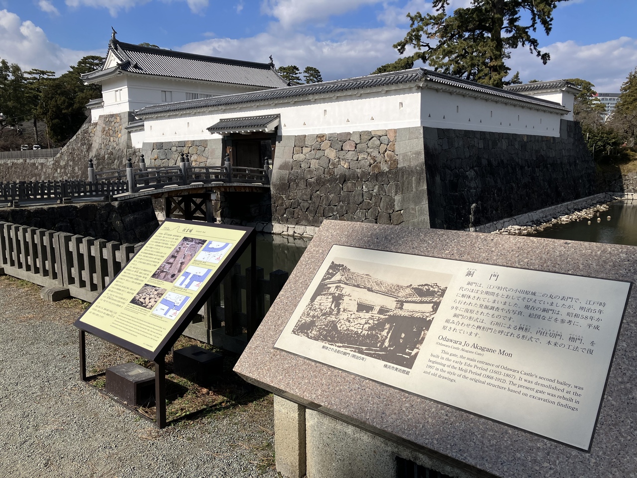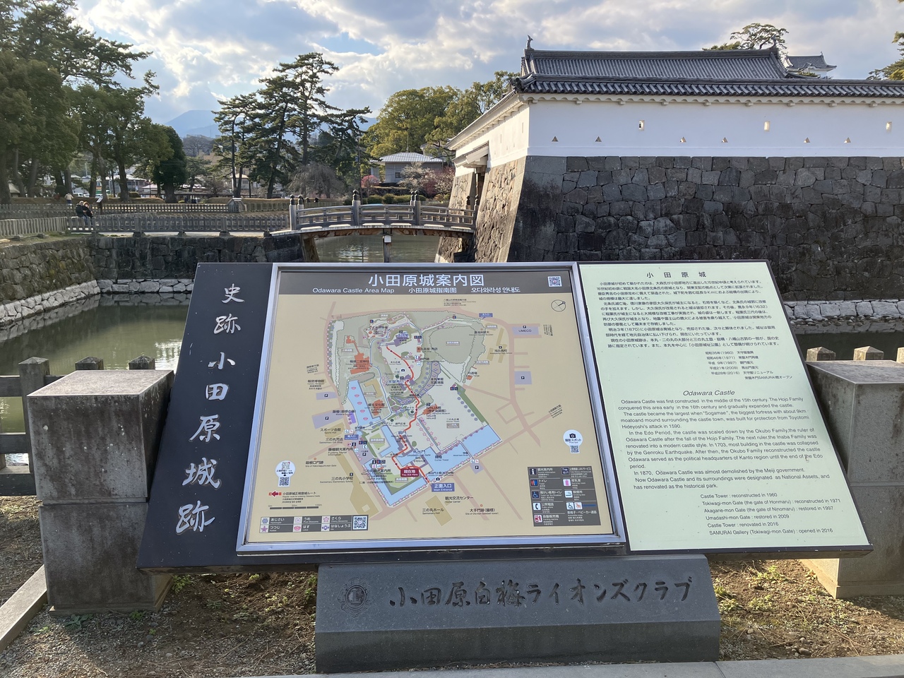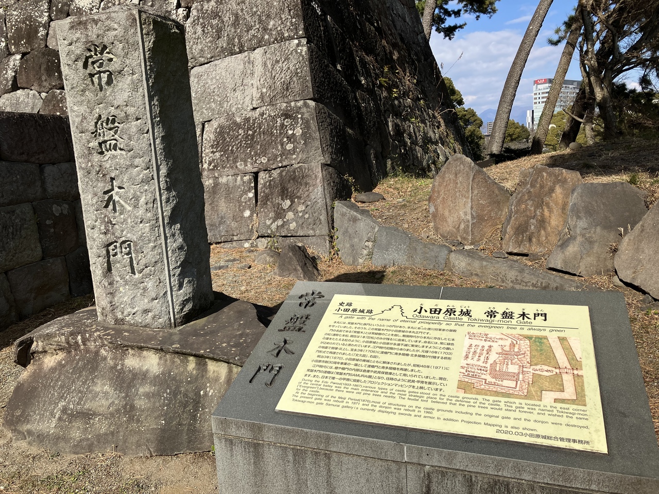 常盤木門は小田原城の本丸正門にあたる門だそうです。どっしりとした構えで重厚感があります。オリジナルの常盤木門は明治3年に解体されてしまい、現在の門は昭和46年に再建されたものだそうです。常盤木という名前は、本丸に存在した7本の松に由来していると案内板にありました。