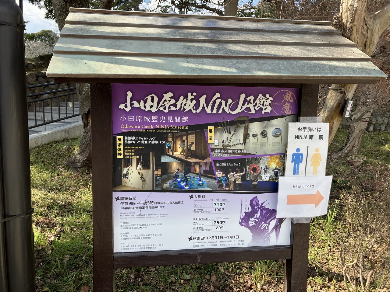 小田原城址公園内でも天守閣と同じくらい賑やかな場所でした。もともとは歴史見聞館と呼ばれていたそうですが、現在は忍者をテーマに体験型の展示が楽しめる施設になっています。入館料は大人が310円です。入口には忍者の顔パネがありましたが、写真を撮っている人はいませんでした。