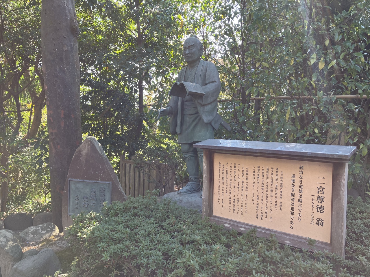 小田原観光では、駅をはじめ二宮金次郎さんの像をあちこちで目にしました。小田原が出身地だったということを初めて知りました。二宮金次郎さんを祀る報徳二宮神社にも金次郎さんの像があり、ひとつは御馴染みの薪を背負った少年の像で、もう一体がこちらの大人になった二宮尊徳さんの像です。珍しいなと思って見入ってしまいました。