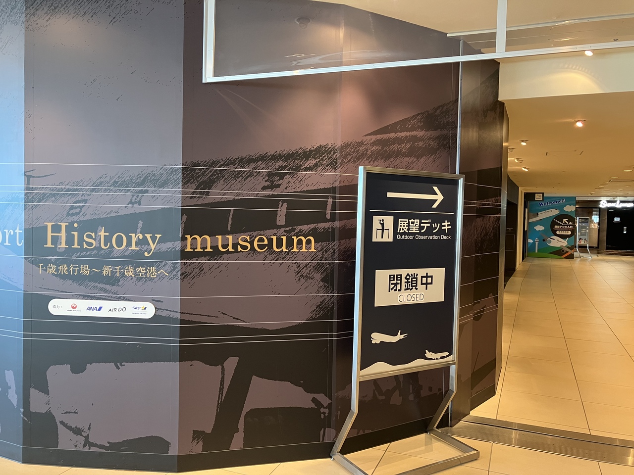 北海道旅行で新千歳空港に降り立った際、電車まで時間があったので空港内を探索しました。3階に新千歳空港の歴史を紹介するエアポートミュージアムという施設があり、その横が展望台の入口だったのですが、あいにく冬季は休業中でした。でもフードコートから離発着する飛行機の姿がよく見えました。
