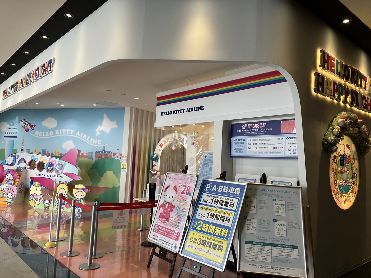 新千歳空港の3階にあります。国内線と国際線線を繋ぐ連絡通路、スマイルロードにあって、ドラえもんのテーマパークの隣です。空港の連絡通路はシンプルなところが多いように感じていましたが、子供が喜ぶ施設があるのは嬉しいです。カフェもあって、サンリオキャラクターの可愛いメニューもありました。