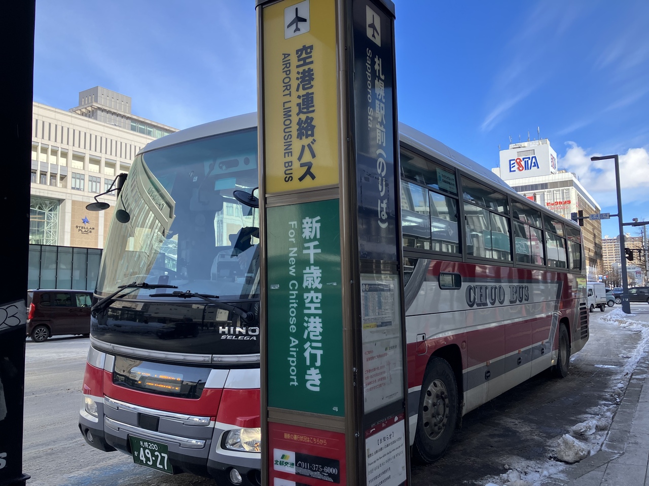 新千歳空港と札幌市内を結ぶバスです。片道1100円で、1時間20分ほどで到着します。札幌駅前のバス停は大通りにあるので乗り場は分かりやすいと思います。空港から札幌へは快速エアポートの利用も便利で、料金は1150円なのでバスとあまり変わらず、時間は短縮できます。