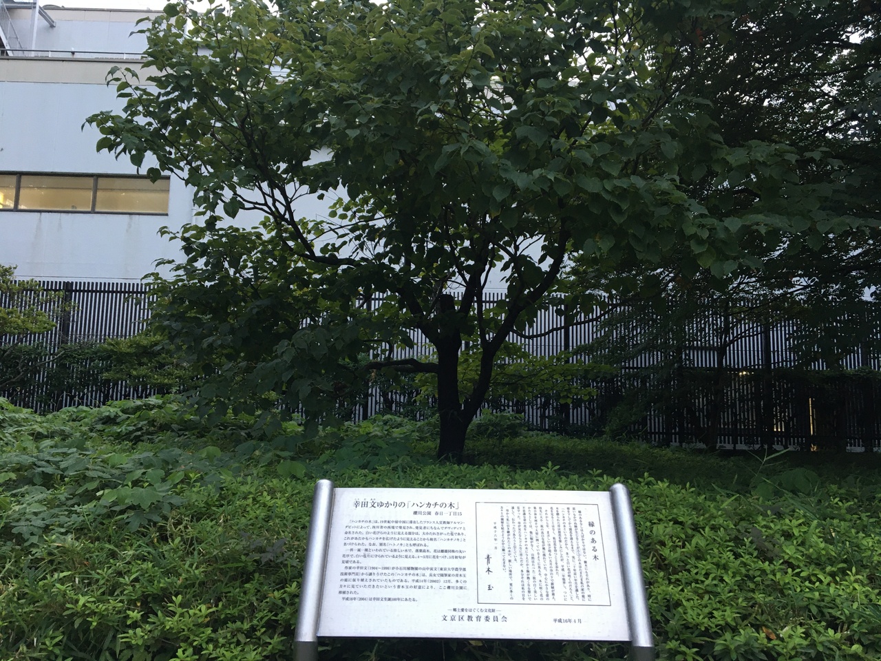 礫川公園の中にある木で、文京区教育委員会による案内板が設置されています。それによると、作家の幸田文が小石川植物園の山中寅文から譲り受けた「ハンカチの木」を、幸田文の長女で随筆家の青木玉が多くの方々に見ていただきたいと公園内に移植されたものだそうです。
