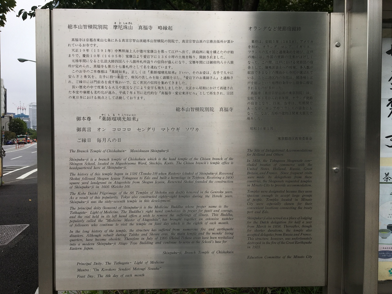 休日に虎ノ門ヒルズでランチをした後、愛宕神社の方へ大通りを歩いていると、真福寺というお寺の前で、港区教育委員会による案内板を見つけました。それによると、真福寺は、安政5年から約半年間、オランダ使節の宿舎となっていたとのことでした。日本と海外の繋がりを感じます。