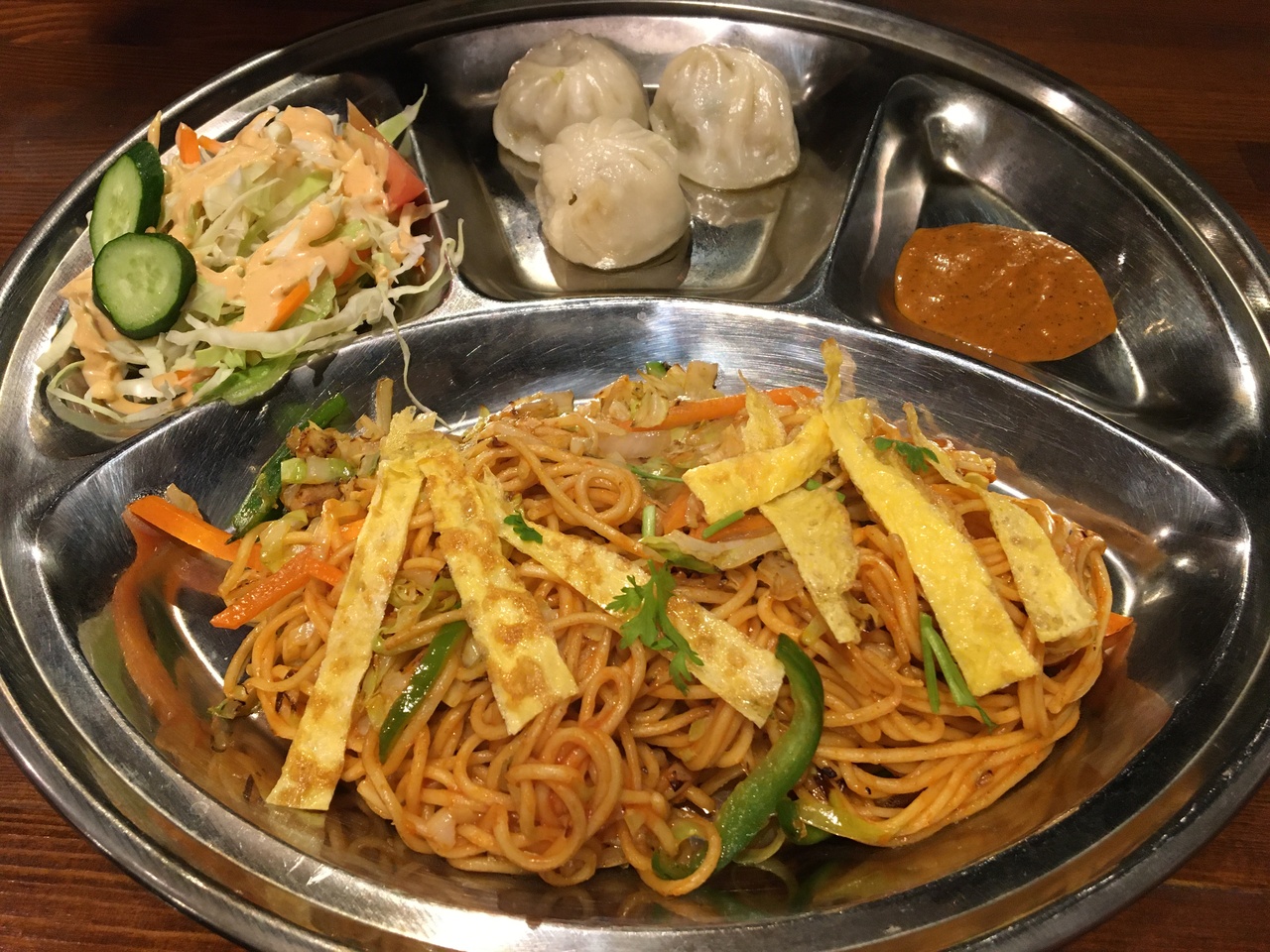目黒駅から歩いて5分弱の場所にあるビルの2階にお店があります。土曜日の12時過ぎに来店。すぐにカウンターに座れました。ネパール風焼きそばとモモのセット(970円)を注文。15分くらい掛かると言われたので、セットのラッシーを飲みながらのんびり待ちました。出来上がった焼きそばとモモは熱々で湯気が出ていました。焼きそばは、正直なところ、ナポリタンとソース焼きそばを足して2で割ったような中途半端さがありました。モモはもちっとした皮の中に肉汁が詰まっていて最高でした。