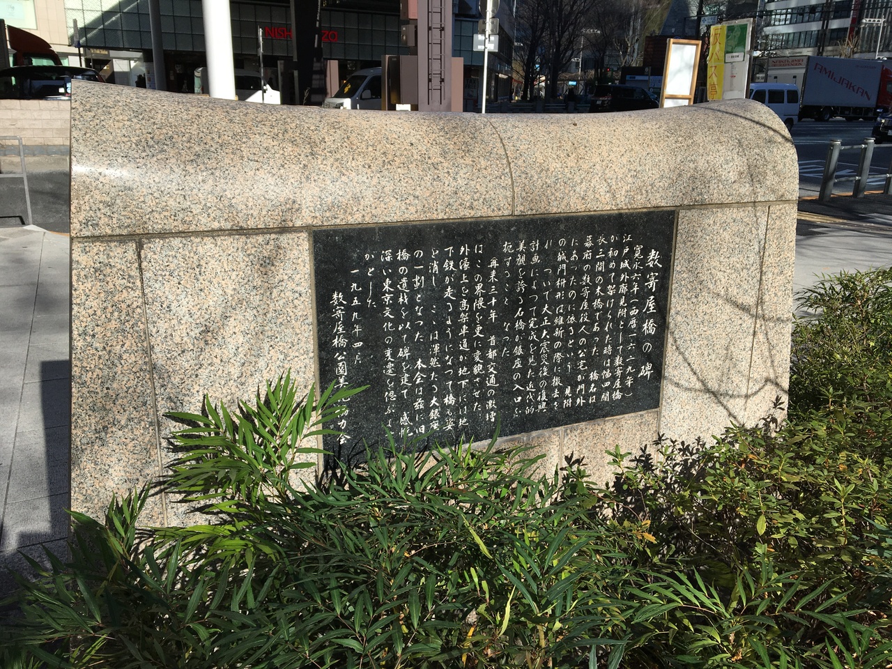 有楽町駅のすぐ近くにある東急プラザ銀座の横に、数寄屋橋公園があり、その一角に「数寄屋橋の碑」と書かれた石碑があります。現在では橋があった面影はありませんが、江戸時代には江戸城外郭見附として橋が架けられていたとのことです。大通りに面しているので人の通行量が多い場所です。