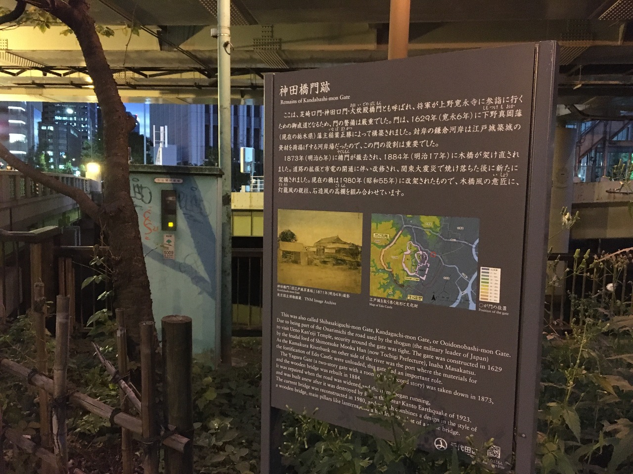 神田エリアから東京駅の方面に歩いて向かっている途中で神田橋を渡った際に、橋のたもとに案内板を見つけました。江戸時代に将軍が上野寛永寺に参詣に行く際の御成道となっていた場所だそうです。夕方の時間に通りましたが、ちょっと暗くてハードボイルドな雰囲気がある場所でした。