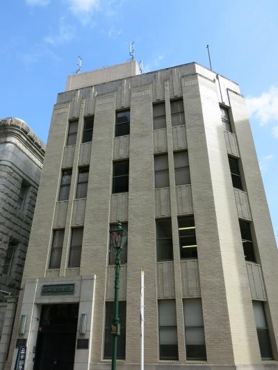馬車道にある神奈川県立歴史博物館の通りを挟んで向かい側にある歴史建造物です。一見シンプルな四階建てのビルなのですが、入口の部分にある重厚な扉や壁面のほんのり色が付いたタイルの繊細な模様など、静かな美しさが感じられます。内部に立ち入ることはできません。