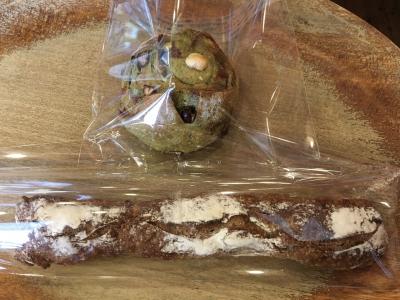 西馬込駅南口を出て、大通りを渡ってすぐのところにお店があります。土曜日の14時過ぎに来店。お客さんが絶えずやって来ています。売り切れているパンも多かったです。抹茶と5種のかのこ豆(270円)と、胡桃、カシューナッツとアーモンドの3種のナッツが練り込まれたパン(270円)を買いました。